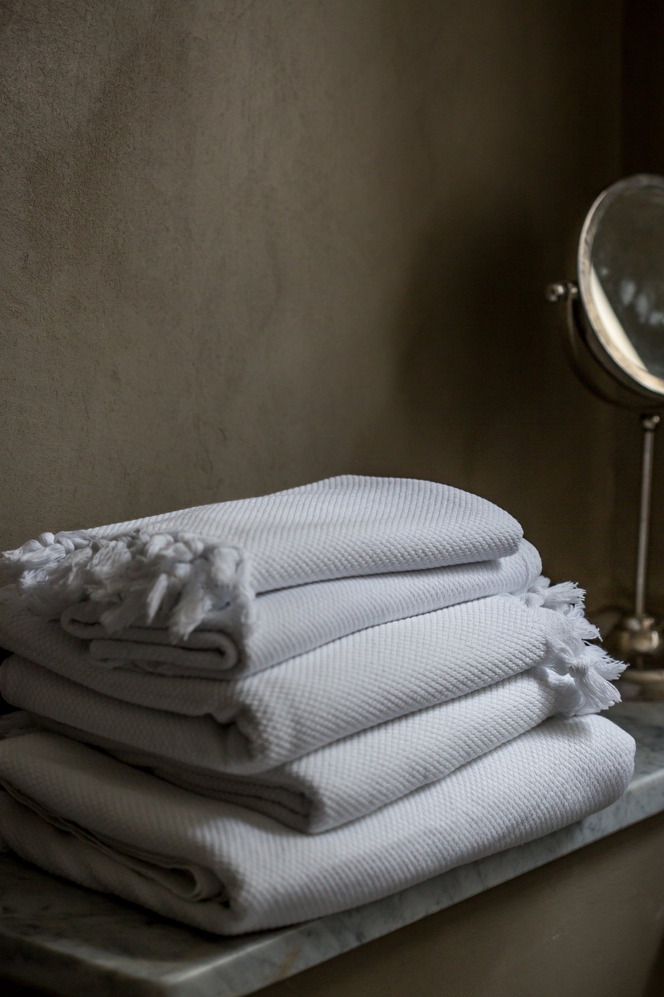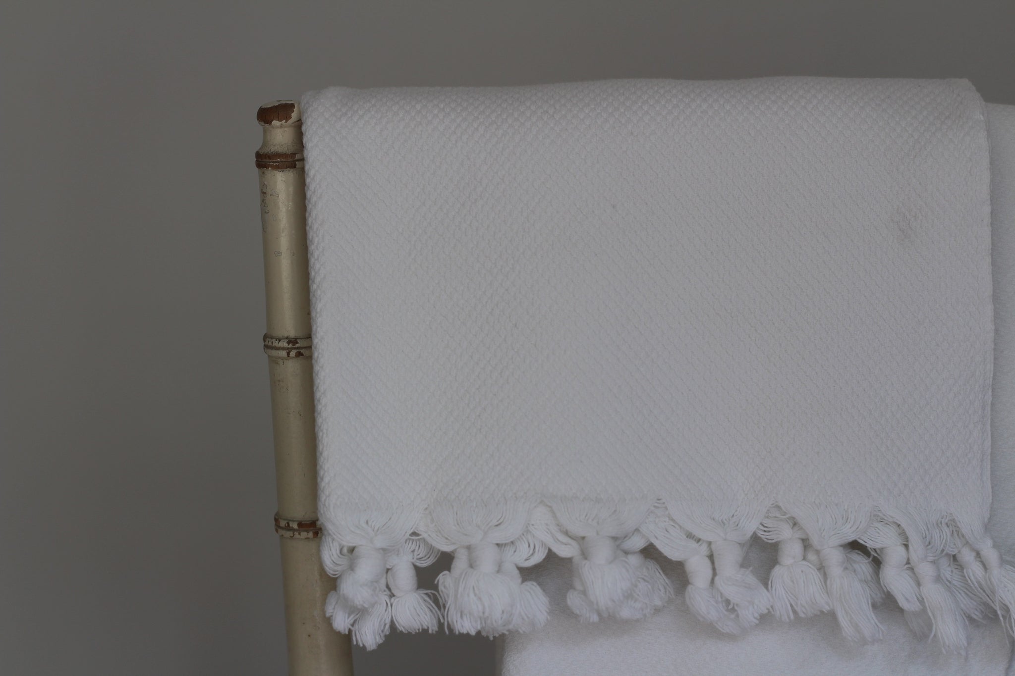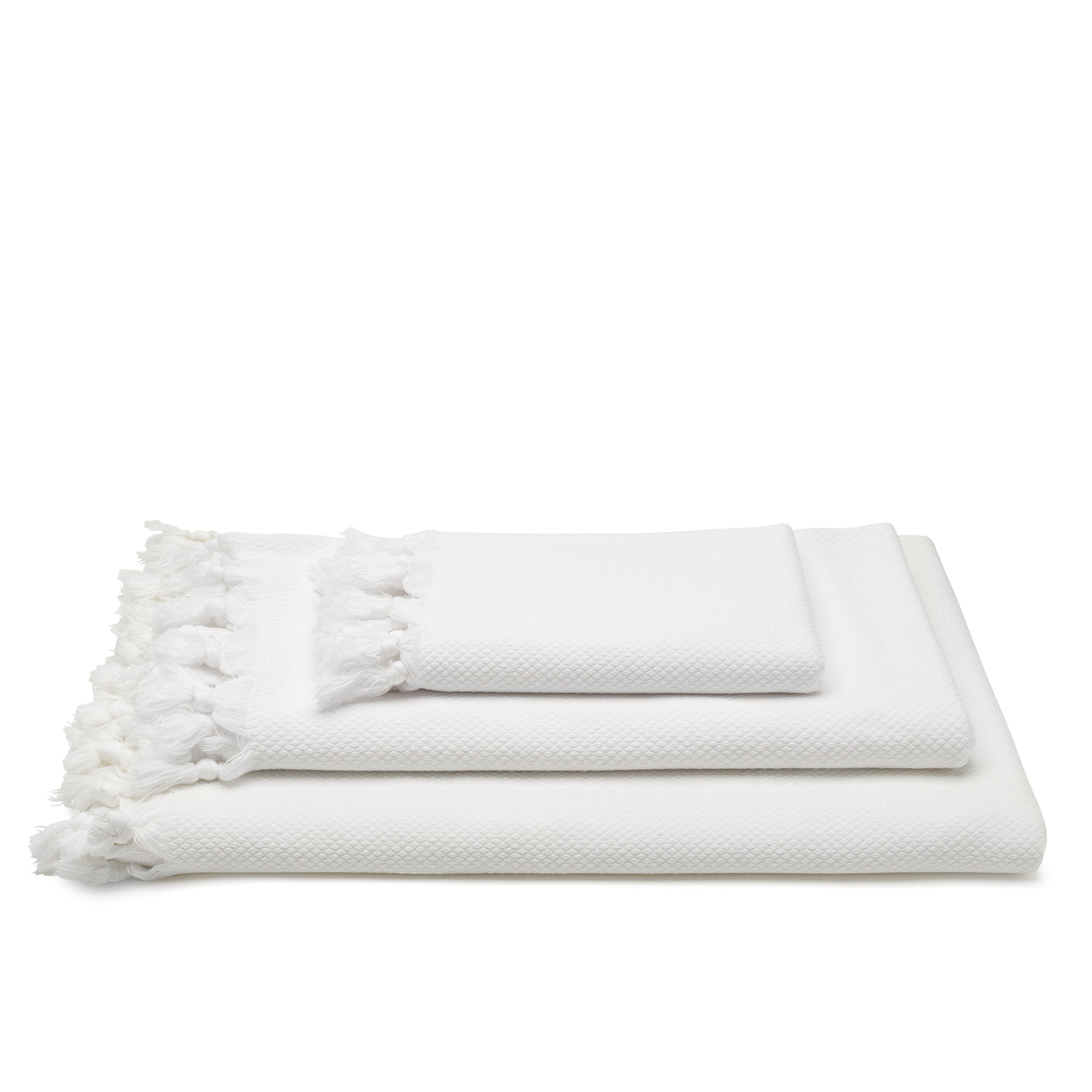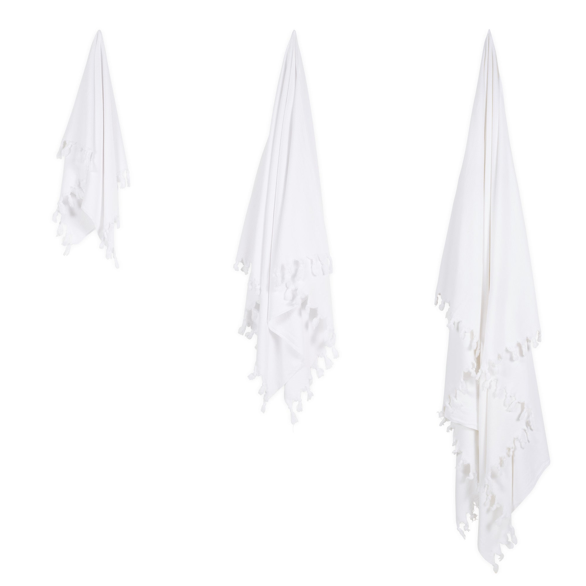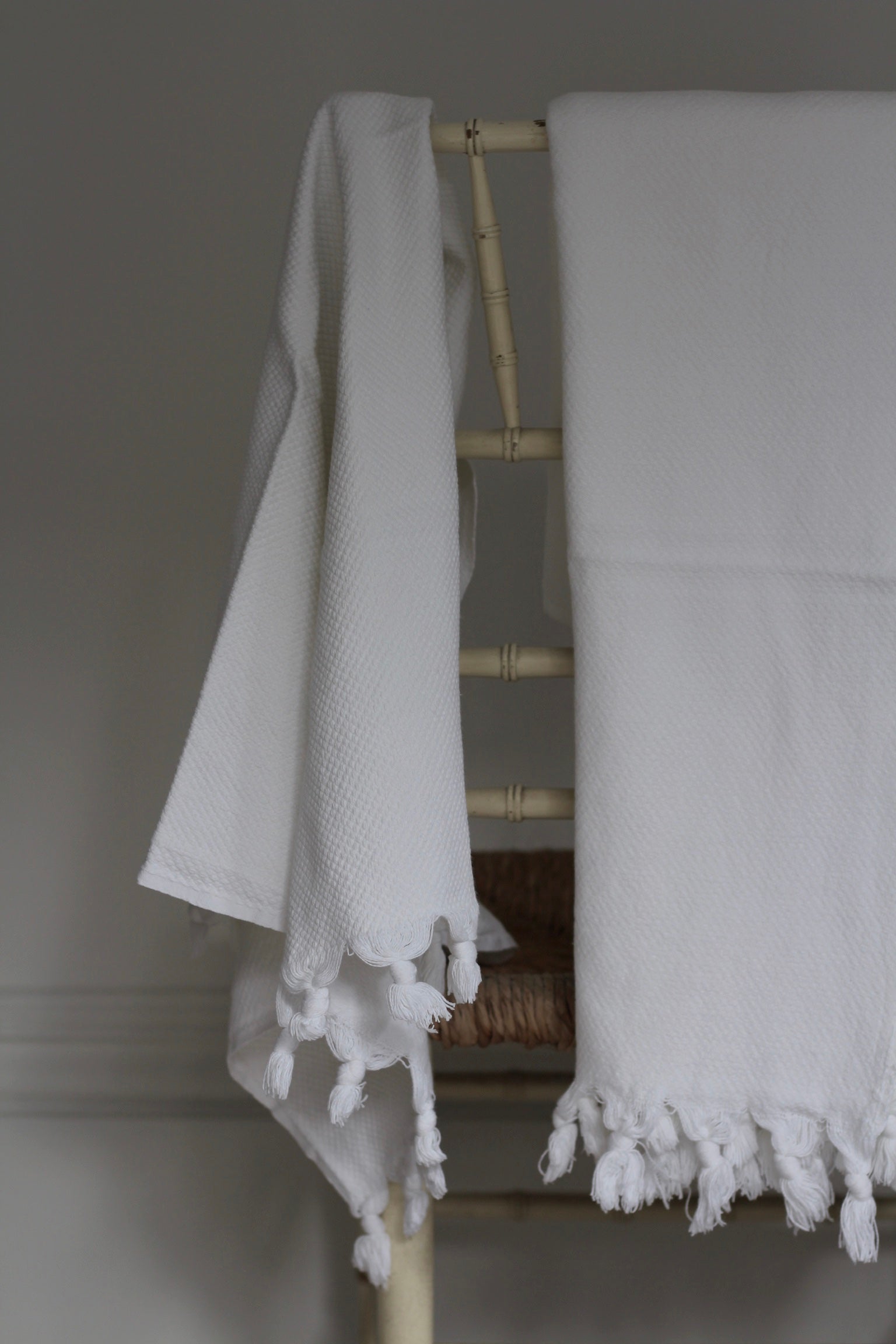 These elegant white cotton towels are made from 100% premium Turkish cotton renowned for being incredibly soft, absorbent and quick-drying. They are hand-woven using a diamond weave that draws moisture away from the surface and into the base layer. This makes them more absorbent and lightweight compared to traditional terry cloth towels. Turkish cotton also remains soft and supple even after repeated washes. Edged with fluffy hand-knotted tassels, these towels are a mix of luxury spa-waffle crossed with sumptuous hammam.
