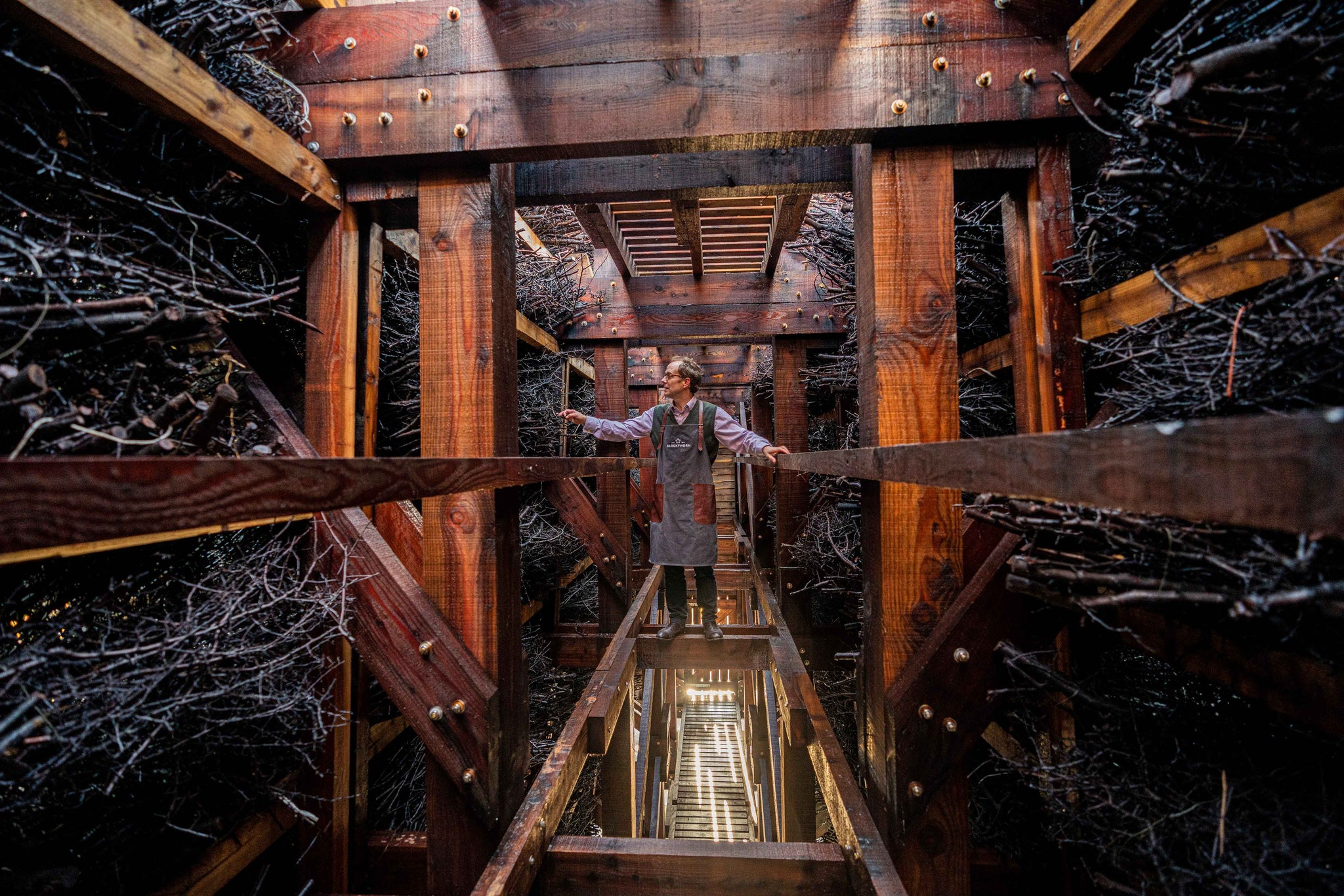 Scottish sea salt flakes produced using a traditional method involving huge towers of blackthorn branches. The salt water is gently dripped down between the towering stacks of branches and the Scottish winds and sunshine create the right environment to evaporate the water.