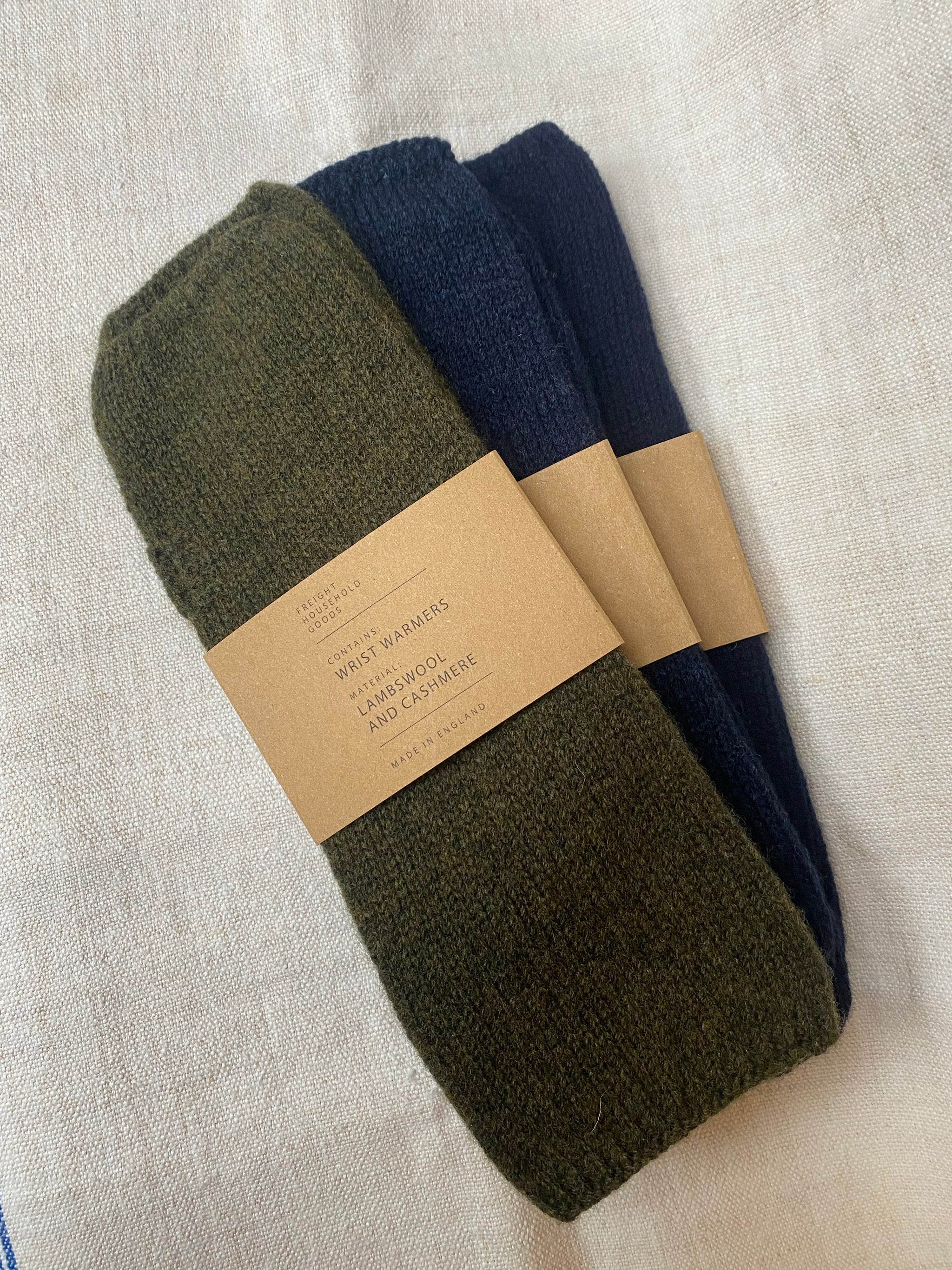 A very simple design of wrist warmer, perfect to pair with a smart coat, jacket, waterproofs or dog walking attire. These plain knit wrist warmers are made using a quality British lambswool and cashmere blend of yarn. This new yarn gives that added softness that elevates them to a little more luxuriousness than the pure lambswool version. A simple thumb slot is sewn in and reinforced to prevent them slipping off your hand.