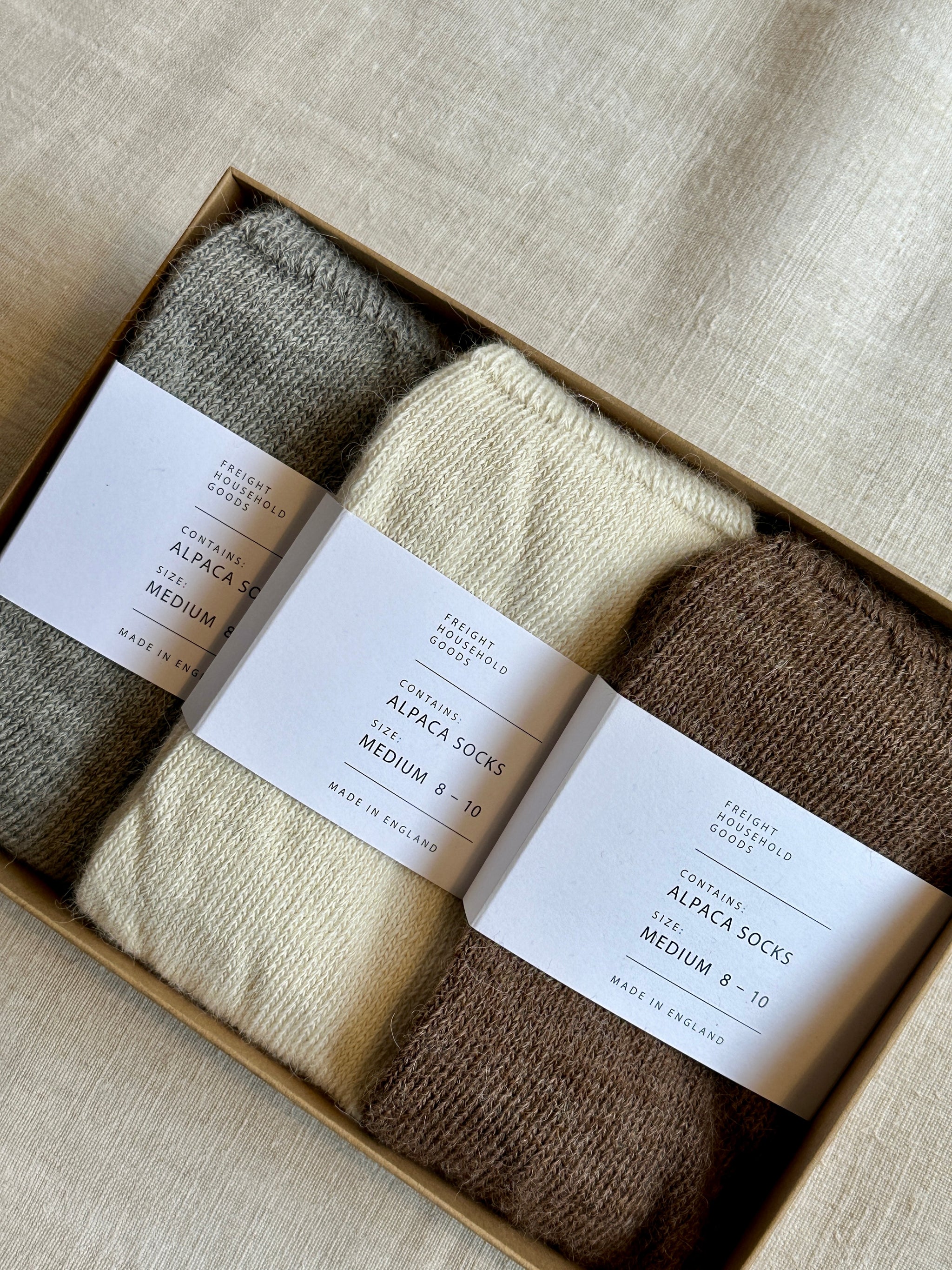 The Freight sock-lover's dream. A trio of our coveted alpaca socks in all natural undyed colours, packaged in a bespoke box with gold debossed Freight stamp and finished with red baker's twine.