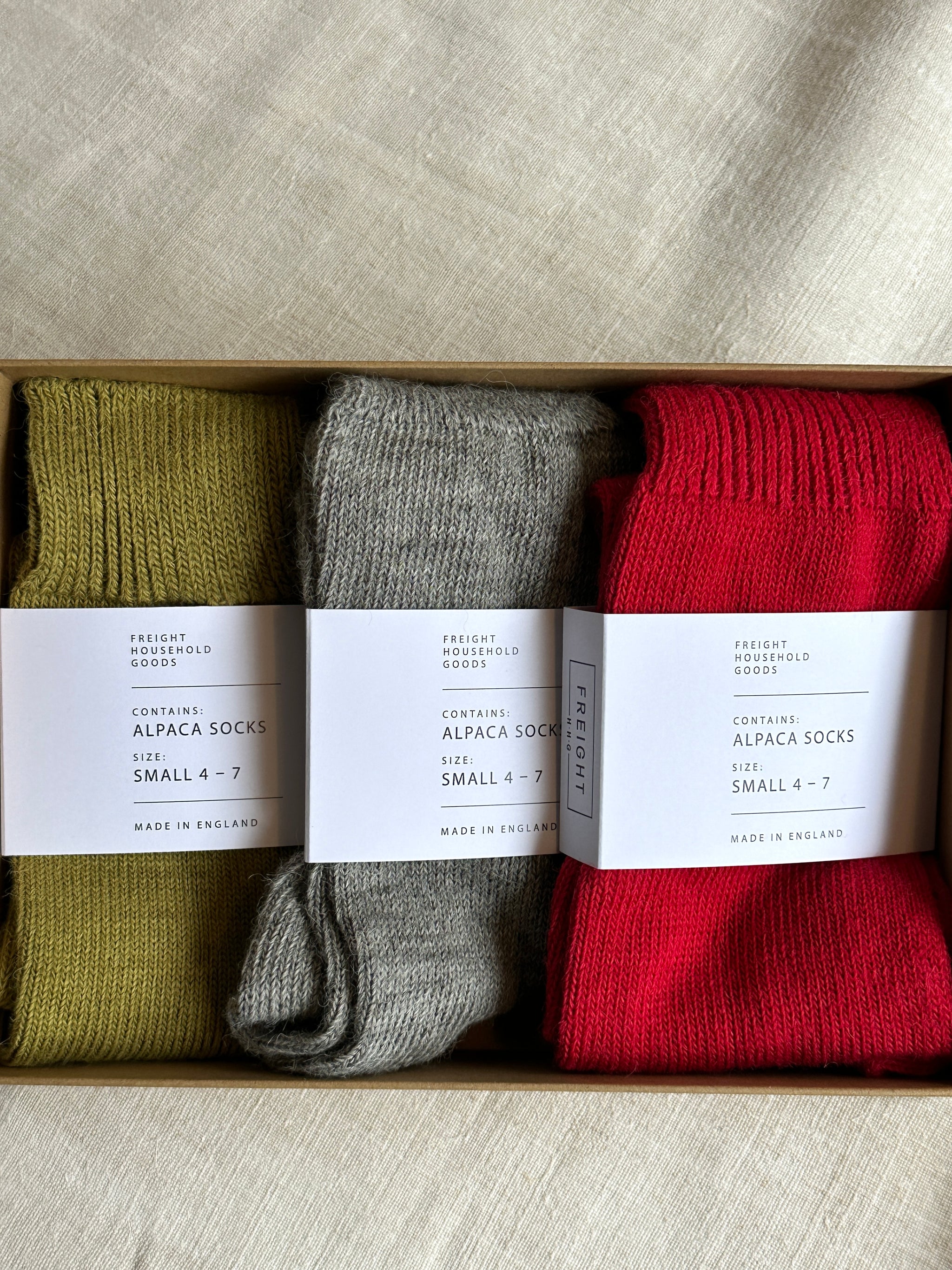 The Freight sock-lover's dream. A trio of our coveted alpaca socks in greengage, grey and red, packaged in a bespoke box with gold debossed Freight-branding and finished with red baker's twine.