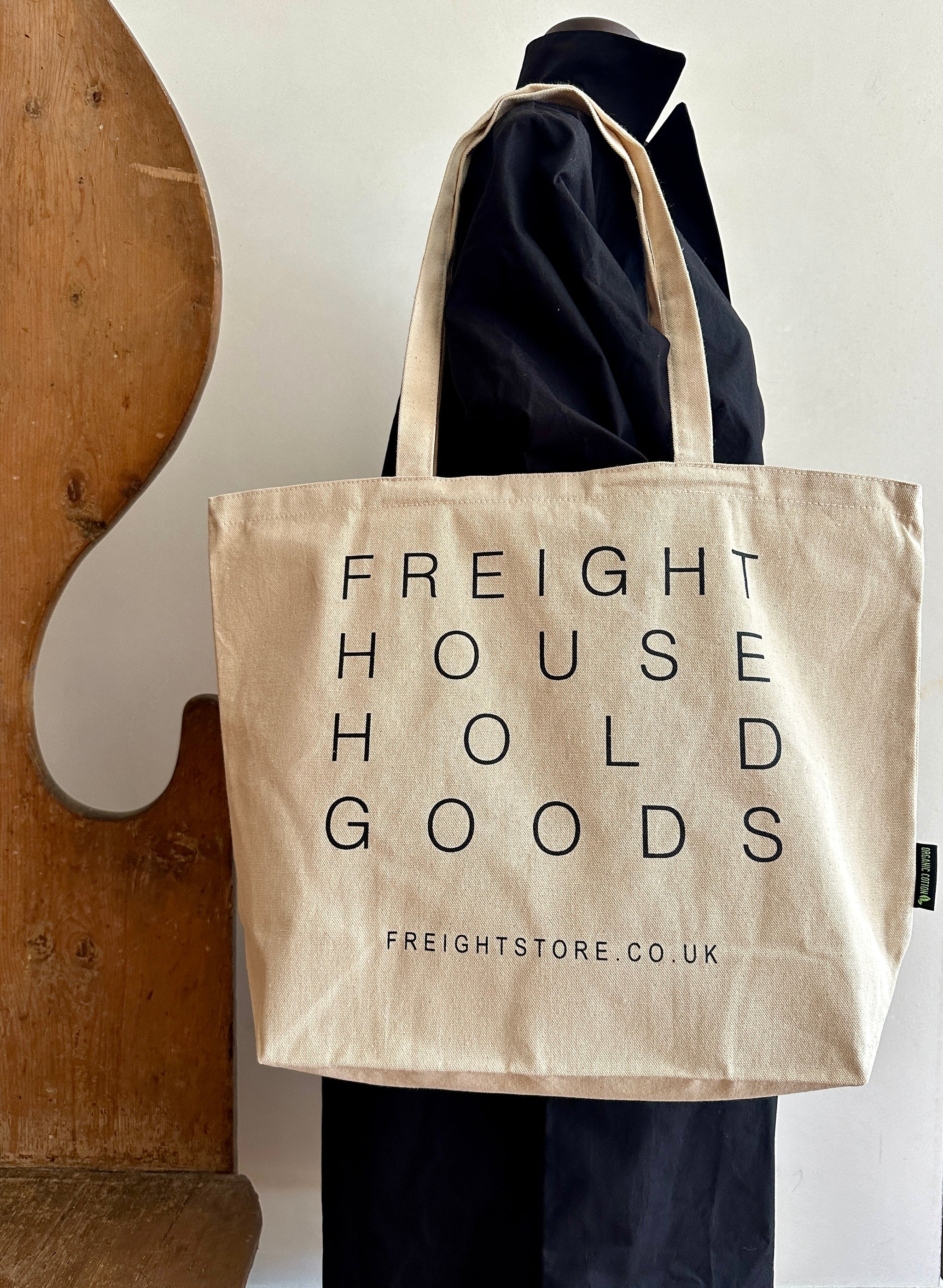 A heavy duty Organic cotton canvas bag produced for Freight using 10oz canvas with the simple Freight logo printed on one side and a new Freight House Hold Goods logo on the other, both screen printed in black.