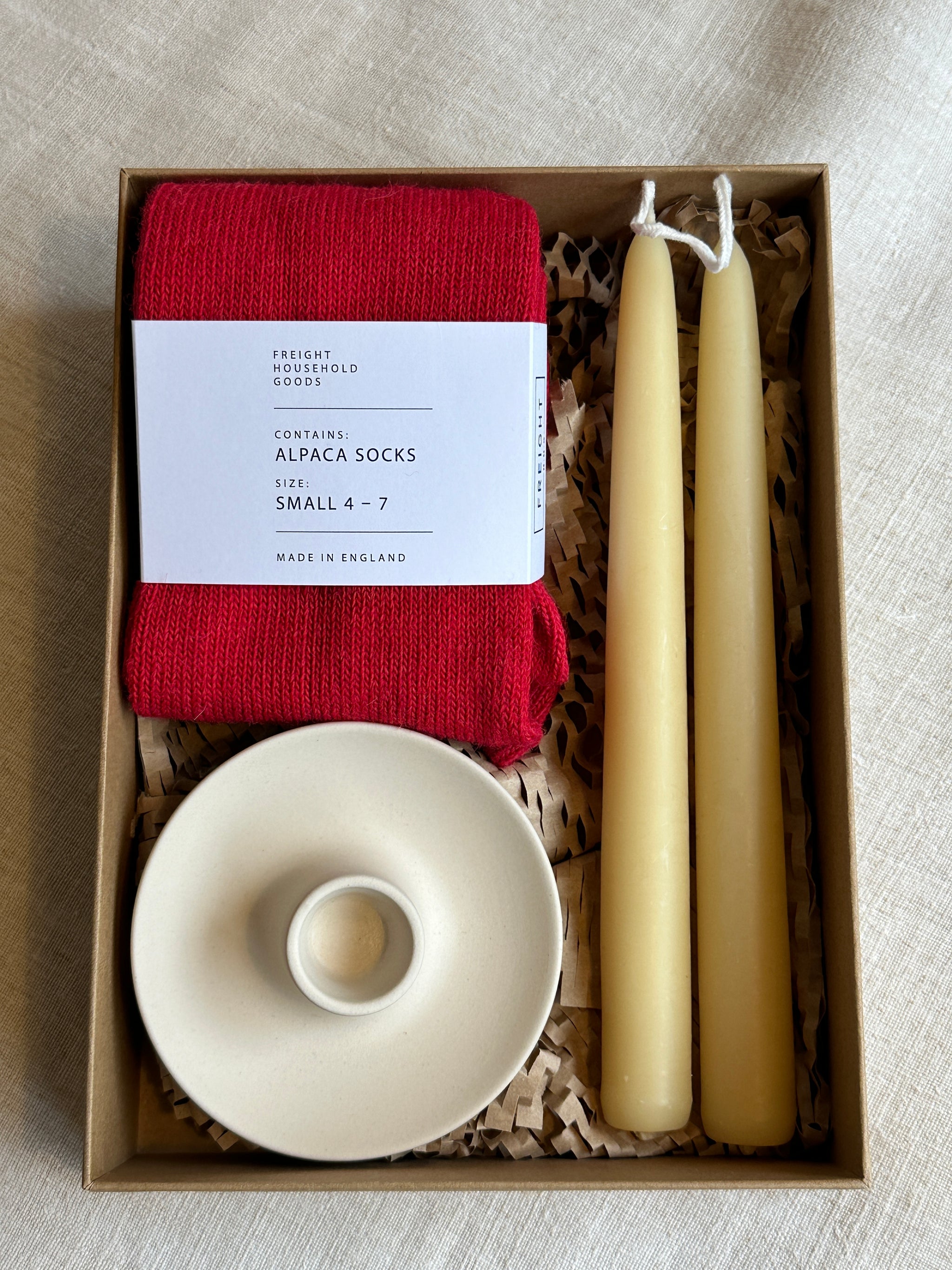 A carefully curated selection of high quality items to enhance the everyday rituals of home, luxurious in their pared-back simplicity. A pair of our coveted alpaca socks in vibrant red, a Freight-designed stoneware candle holder and a complementing pair of pure beeswax candles, all made in England and meticulously crafted.