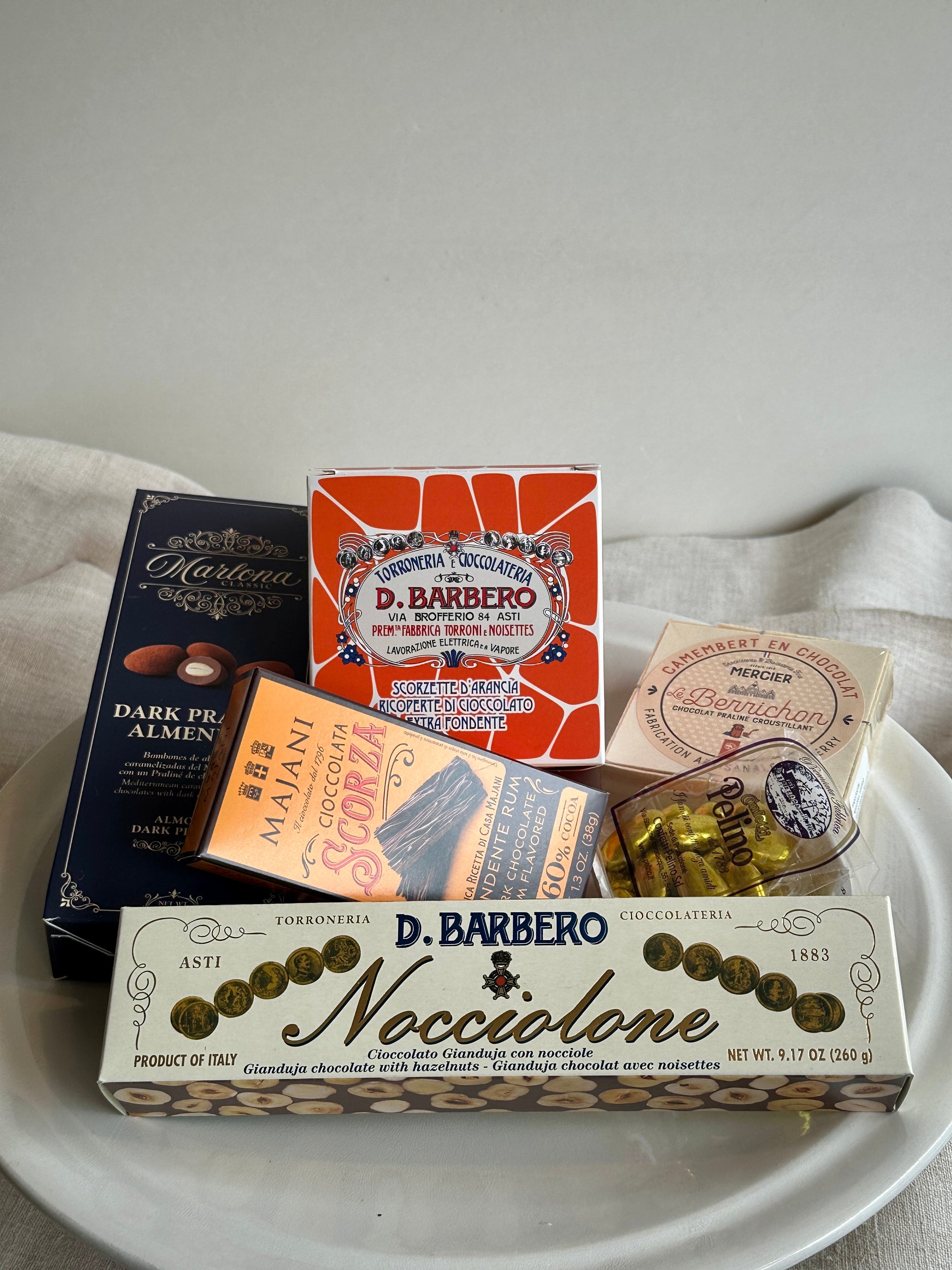 An indulgent box of sweet treats with classic flavour pairings, including dark chocolate-coated orange peel, sugared almonds, chocolate 'camembert' (no cheese involved!), traditional Italian chocolate flakes with rum, chocolate Marcona almonds and a weighty bar of hazelnut chocolate. All nestled in a bespoke Freight-stamped magnetic box and finished with red twine.