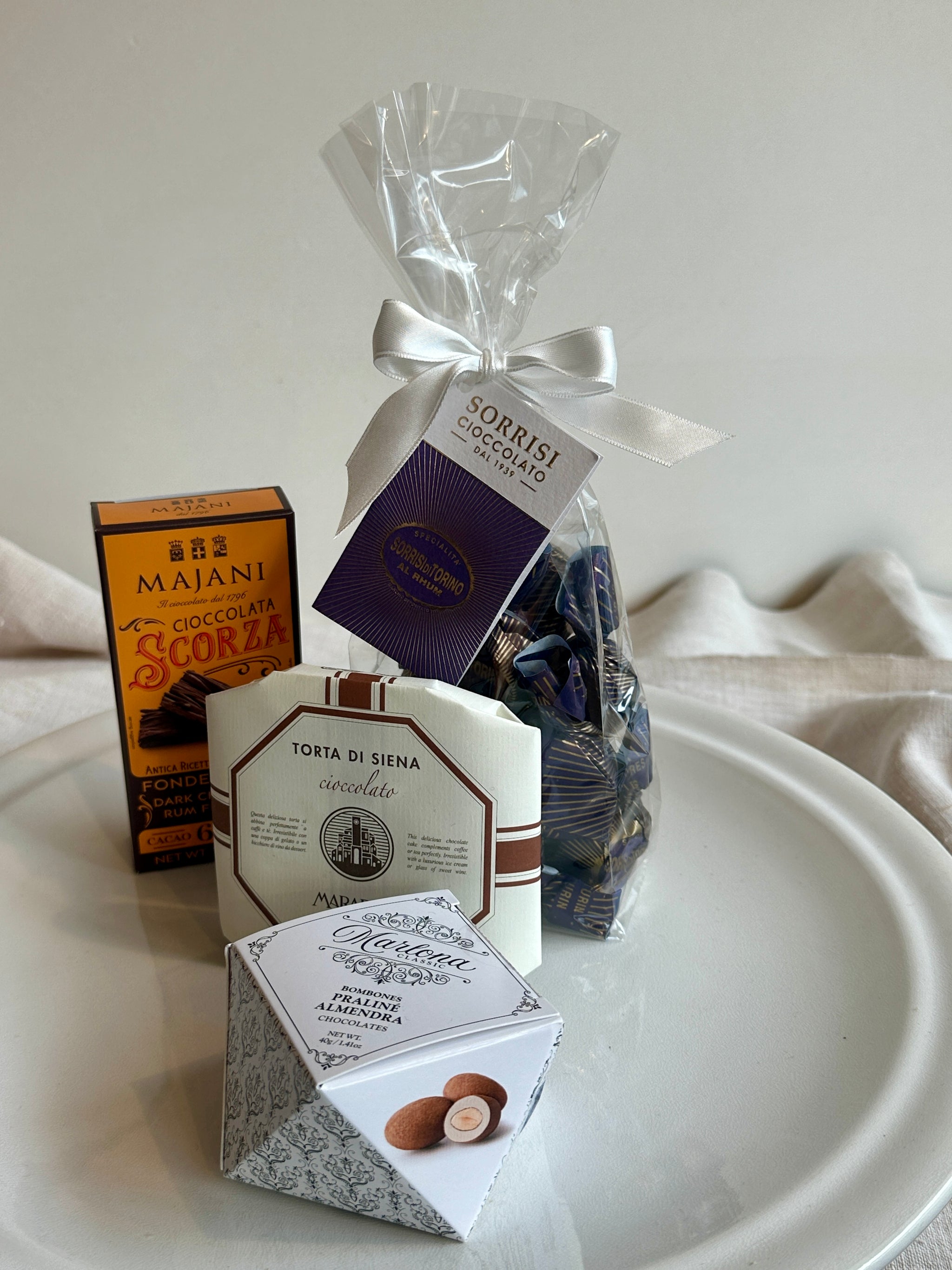 A selection of delicious chocolates with a little infusion of rum! The box includes our ever-popular dark chocolate and rum Sorrisi, Marcona almonds in praline and two new products: the chocolate panforte and the Italian 'Scorza' (meaning tree bark). All incredibly moreish. Packaged in a card box with gold debossed Freight stamp and finished with red twine.