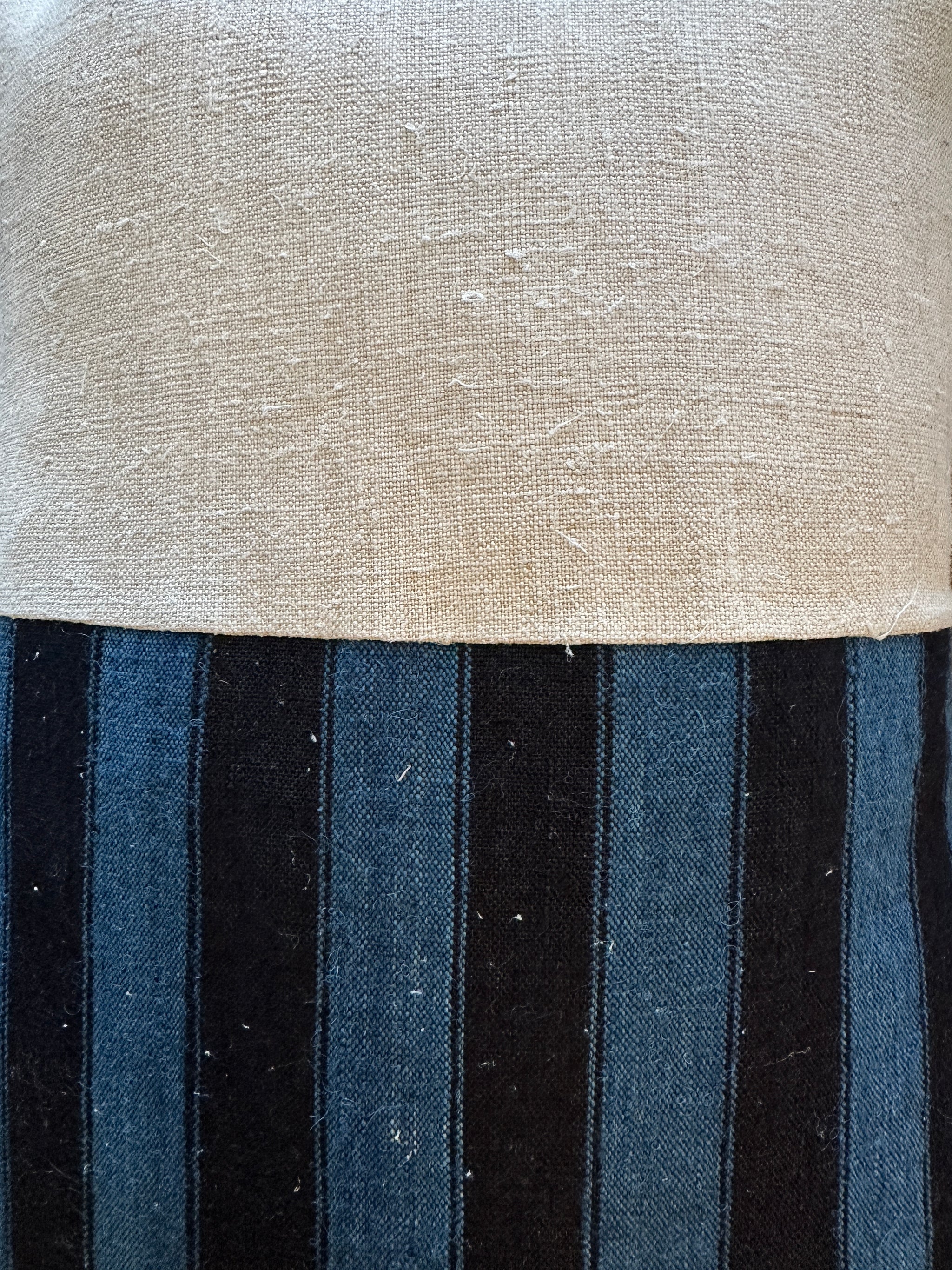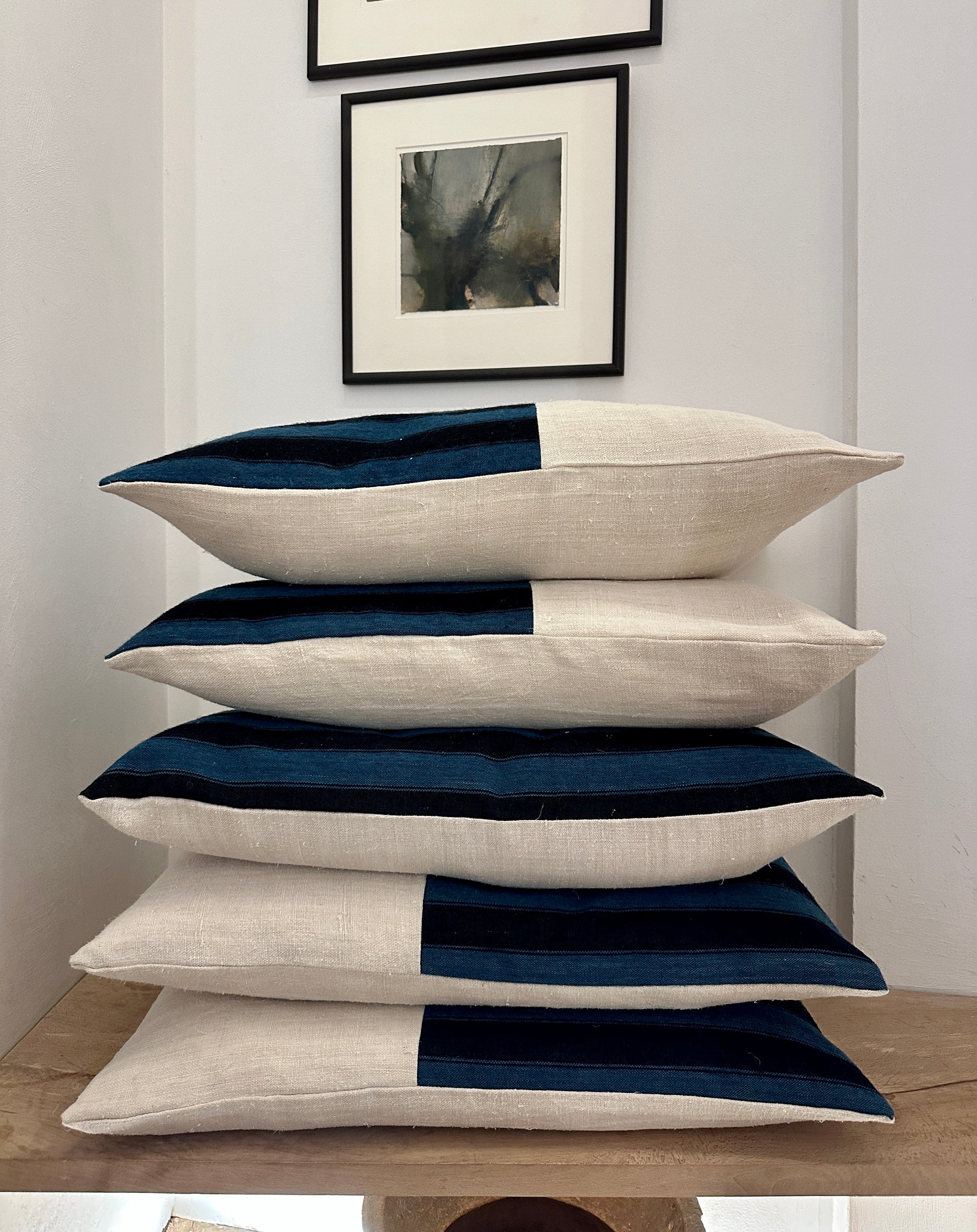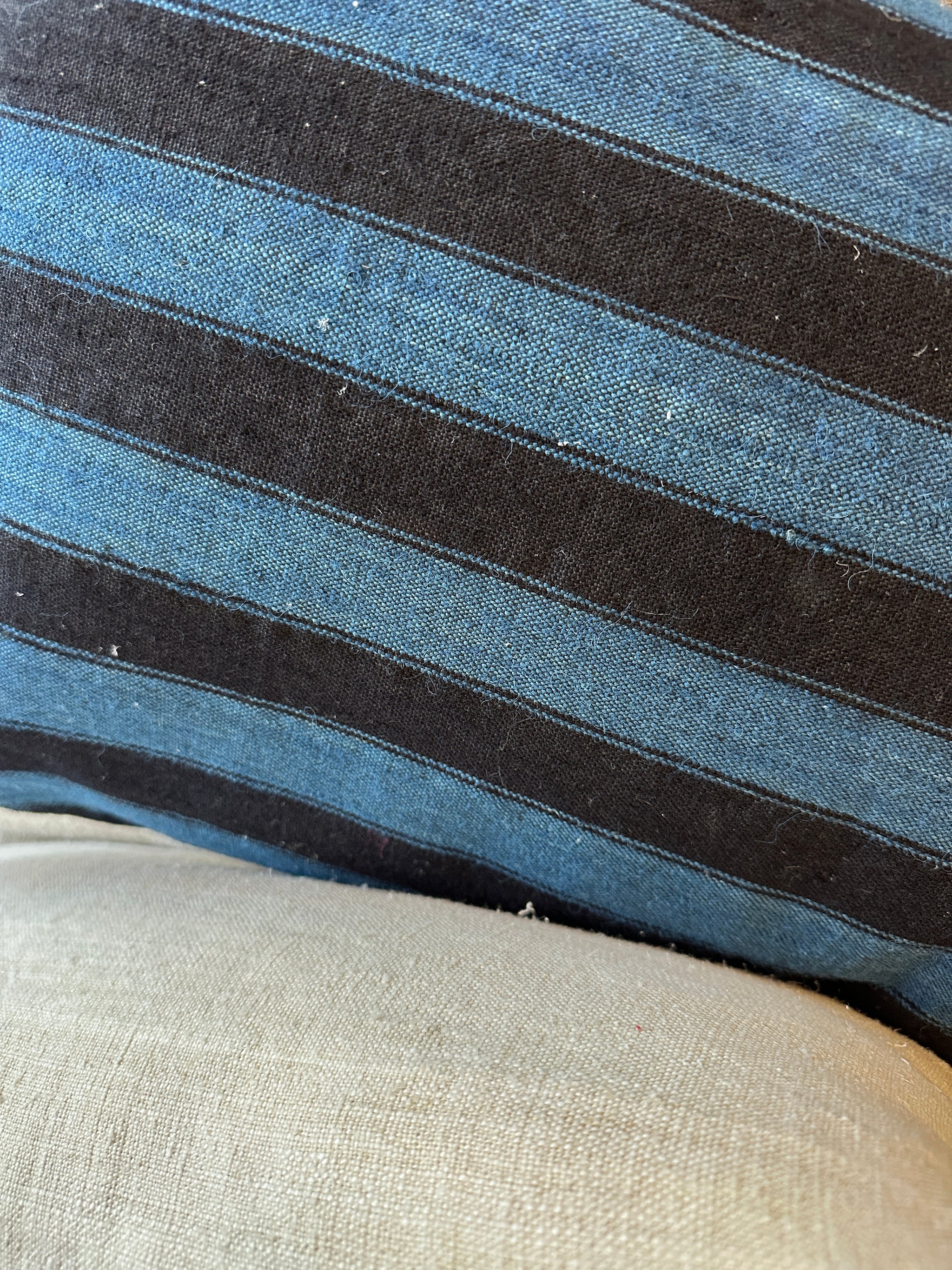 This stunning indigo blue and black striped fabric has a beautiful almost lustrous quality to it. A really special find that pairs so well with the natural linen backing fabric. As these are vintage fabrics there are just a few of these cushions available. Each cushion is filled with a duck and down pad and has a hidden zip closure, so the cover can be easily removed.