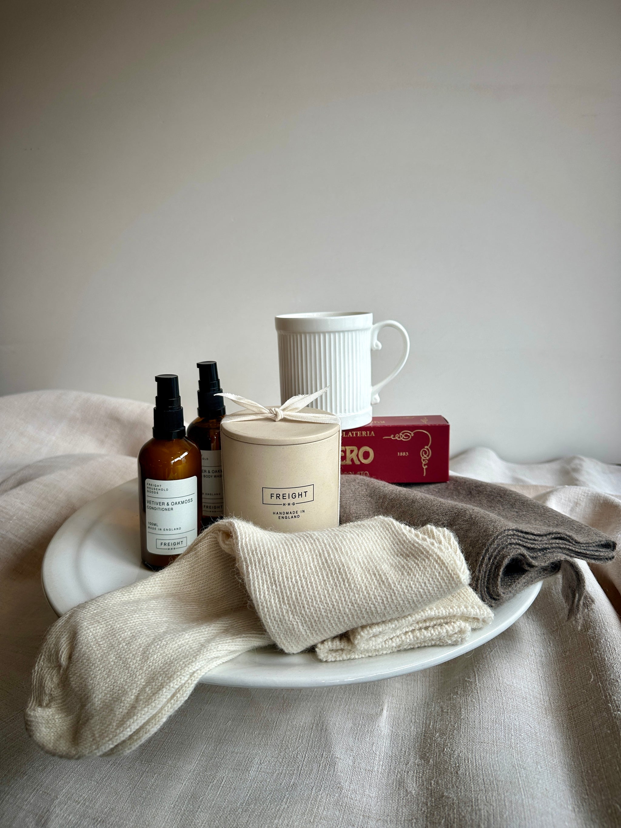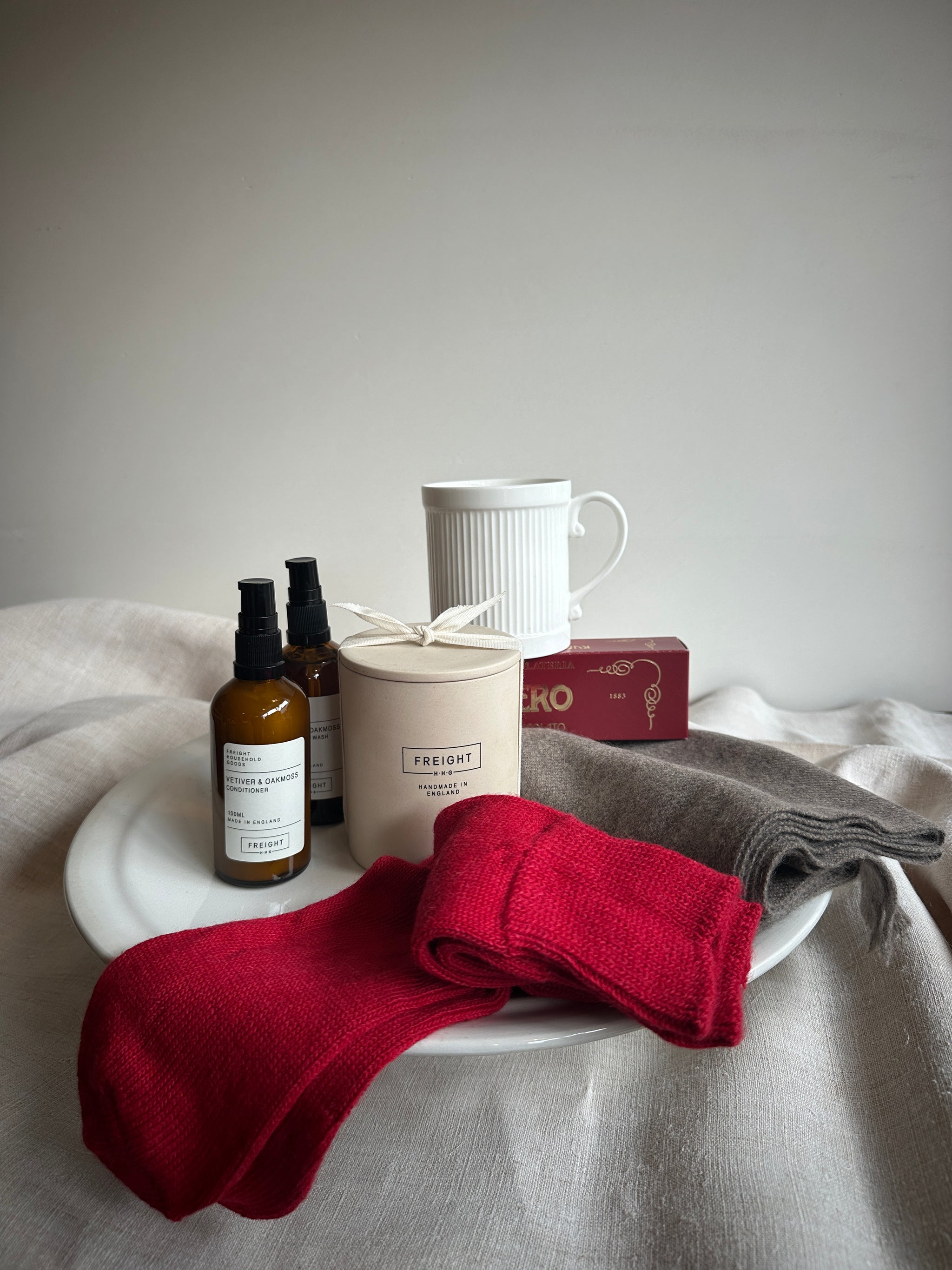 A luxurious collection of timeless Freight classics for the everyday rituals of home. A beautiful 100% cashmere scarf together with our classic alpaca yarn socks, a coveted Freight scented candle, wash and hand cream all in our Vetiver & Oakmoss house scent, our UK-made glazed bone china tea mug and last but certainly not least, a bar of delectable dark chocolate torrone infused with rum. All finished with a bespoke Freight-stamped magnetic box and traditional red twine.