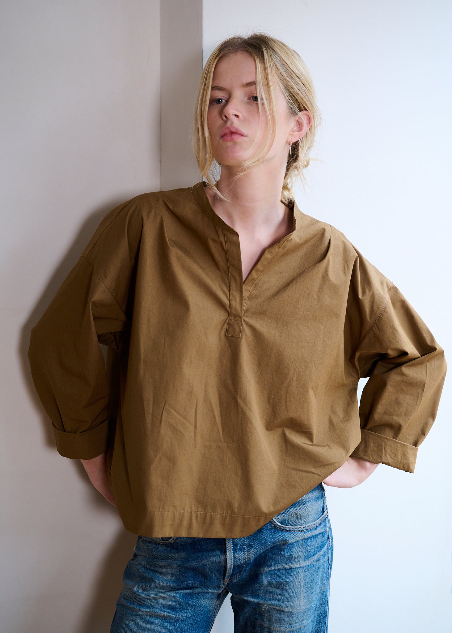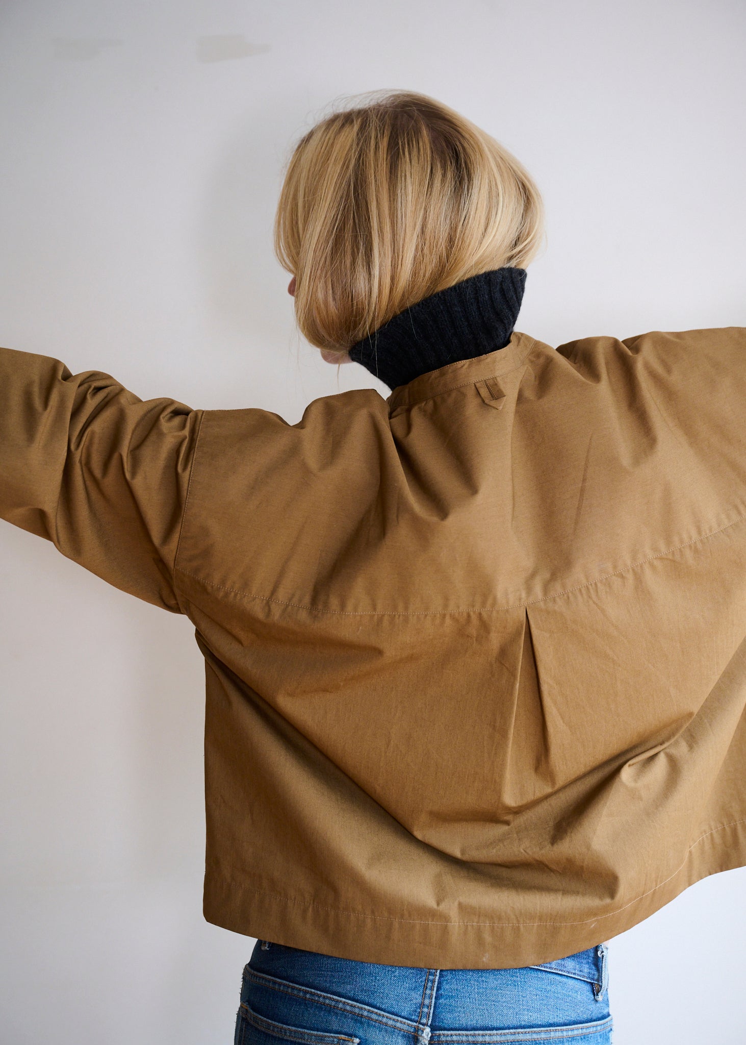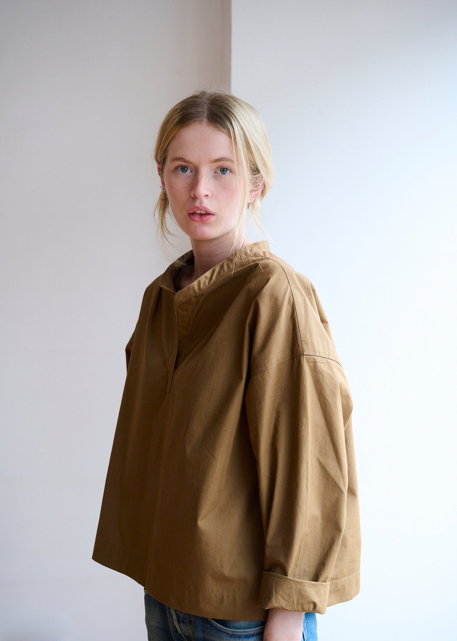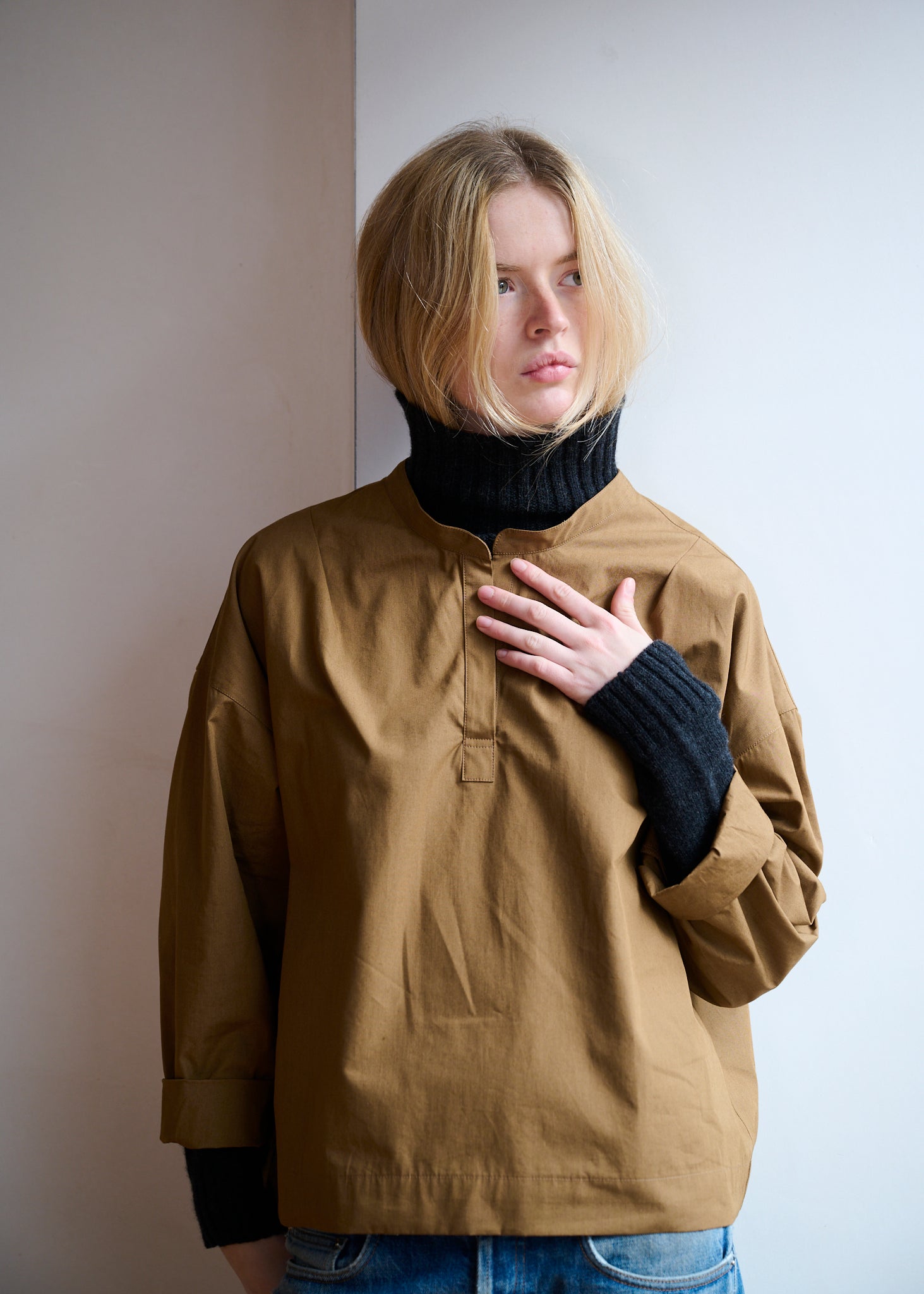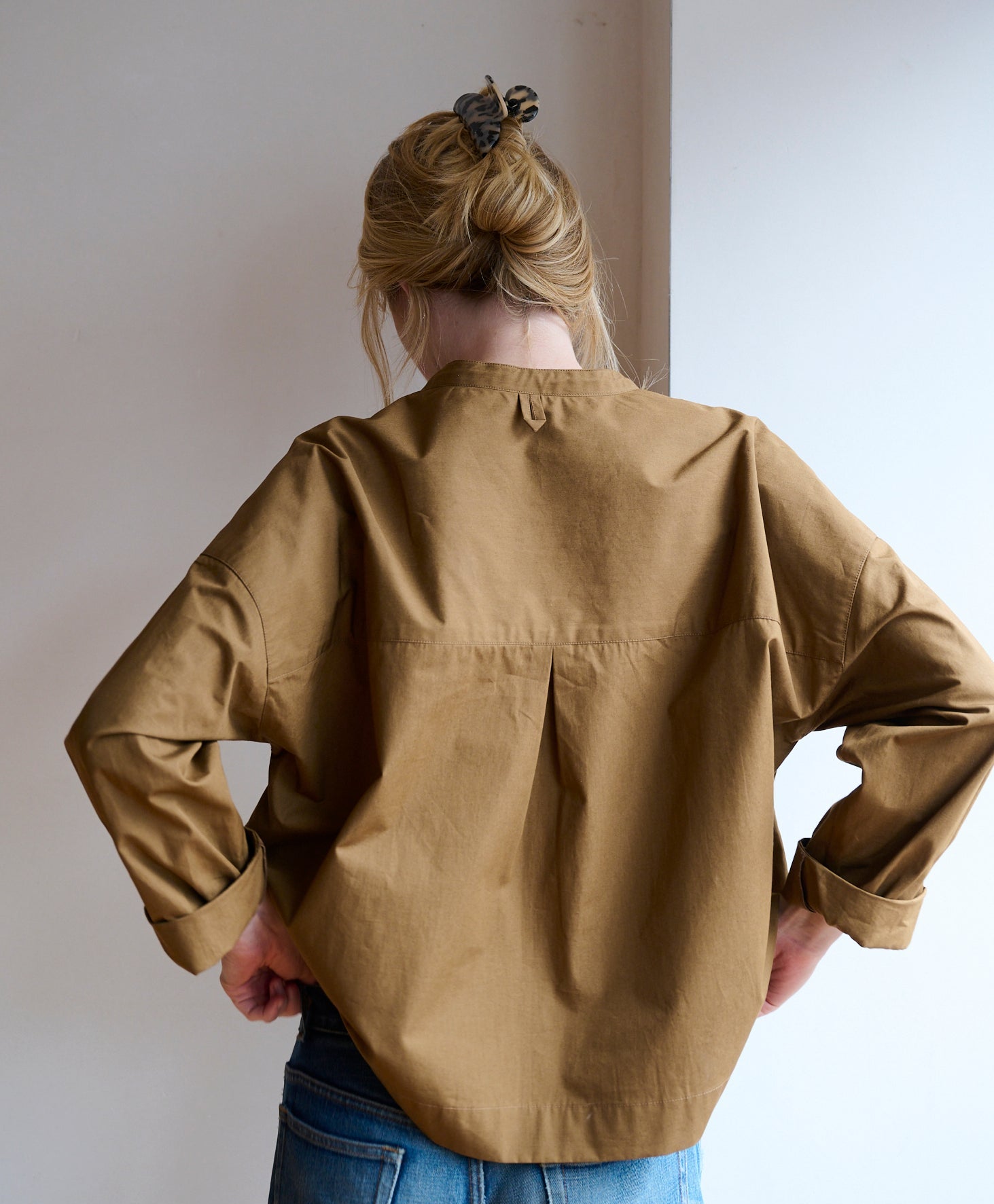 The design is intentionally minimal. A collarless neckline and open placket create a clean, contemporary silhouette, while darts at the shoulder subtly shape the garment for an improved fit. The dropped back hem adds balance and fluidity, giving the overshirt its distinctive profile.